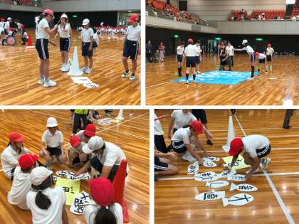 6年生の団体競技です。漢字の書かれた紙を魚釣りのように釣り、自分たちのスペースまで運びます。最終的には、魚へんの漢字として実際にあるものをいくつ釣り上げたかで勝敗が決まります。6年生は、漢字の学習のように頭を働かせて、実際に存在する漢字かどうかを話し合っていました。