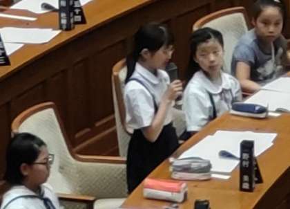 民生保健委員会に所属し、一人ひとりが自己紹介しました。高齢者や障がい者が暮らしやすくなるアイデアや健康な生活づくりについての意見を代表の子ども議員が発表しました。市長からの答えもしっかり聞きました。