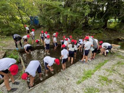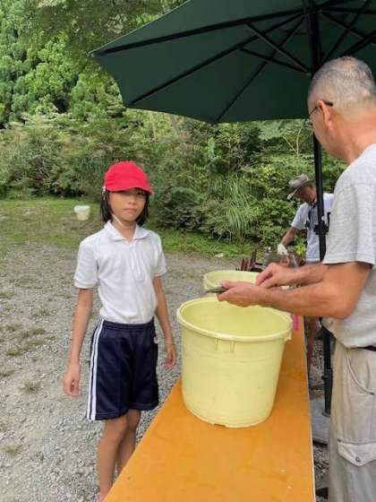 ジュースでひと休みしたあとは魚掴み場に移動して楽しい魚掴みです。開平の子どもたちの苦手種目です。さあ魚たちとの力くらべの始まりです。