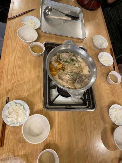晩ご飯は八鹿豚の鍋を頂きます。日本で八鹿豚の生産を行っている牧場がただ一つであること、八鹿豚が養父市のパティシエが作ったケーキを食べて育っていることなど驚きの情報が盛りだくさんでした。もちろん残さず鍋をきれいにさらっていきます。美味しいお鍋のおかげでご飯のおかわりもどんどん進みます。