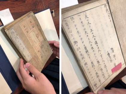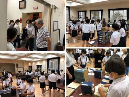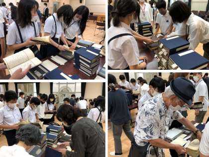 学習会の後、虫食いや落丁などの点検をしながら、たくさんの書物に風を通したり、ほこりを払ったりする作業を行いました。6年生は、最初は「どうしたらいいの?」と心配そうにしていましたが、少しずつ扱い方にも慣れて、上手に虫干しを行っていました。『学問のすゝめ』を点検することになった班では、「これは知ってるよ。1万円札の人だ!!」「前のね。」などの声が聞かれ、教科書で学習したり、紙幣に印刷されたりするような人物が書いた貴重な書物を手に取って見ていることに感動していました。