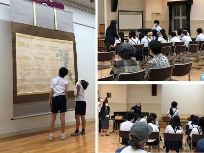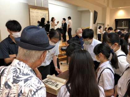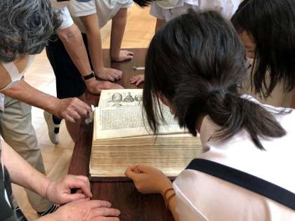 最後に、ヤン・ヨンストンの『動物学全書』や伊能忠敬によって測量され、製作された『大日本沿海輿地全図』なども近くで見ることができました。6年生は特に『動物学全書』に興味津々で、身を乗り出してのぞきこんで見ていました。会の終わりに児童から、「動物学全書の実際には存在しない想像上の動物の絵がすごかった。」「字が難しくて読める本が少なかったので、読めるように勉強して、また将来に読んでみたい。」などの感想が聞かれました。校長先生からは、「愛日文庫があり、このような経験ができる小学校に通っていたということを誇りに思ってほしい。」というお話がありました。愛日文庫を守る会の皆様、ありがとうございました。