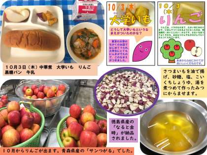 先週から10月の給食が始まりました。秋が旬の食材や秋から冬にかけておいしくなる食材などが登場しています。3日(木)の給食はどれも大人気でした。「今度、大学いもとりんごが給食に出るで〜。」と学校中に給食のメニューの予告が広がっていました。大学いもは、徳島県産の『なると金時』を使用し、りんごは青森県産の『サンつがる』が納品されました。児童にとって大満足の給食だったようで、各学級で「おいしい!!」という声が聞かれました。給食室では、「今日の給食、本当においしかったです。ありがとうございました!!」というお礼まで聞かれました。