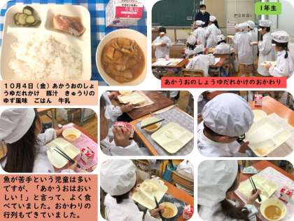 4日(金)のあかうおのしょうゆだれかけは、魚が苦手という児童が多く、しっかり食べられるかなぁと心配でしたが、1年生でも「この魚はおいしい!!」とたくさんの人がおかわりをしていました。どの児童のお皿にも既に食べてしまった後で、あかうおは残っていませんでした。