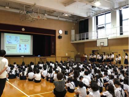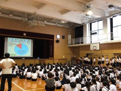 今週は、10月のすこやか週間です。児童朝会時に給食委員会が『よい姿勢で食べよう』という委員会発表を行いました。最初に、全校児童を対象に実施したアンケートの結果を発表しました。よい姿勢とはどのようなものか知っていても、背もたれによりかかったり、ひじをついたり、背中を丸めてねこぜになったりしている人が多いという結果でした。その後、よい姿勢で座るための3つのステップや健康への効果、体のバランスをよくするための体操などを紹介しました。最後に、「日頃からよい姿勢を心がけて、食事のマナーを守り、健康にも気を付けていきましょう。」と呼びかけました。