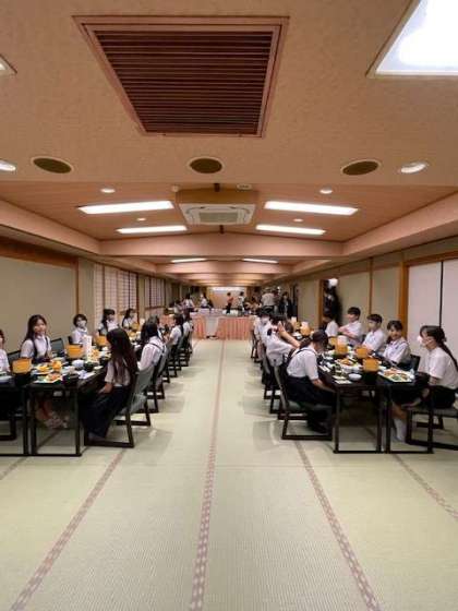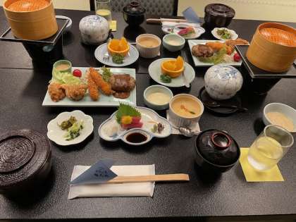 待ちに待った夕食の時間です。大広間に入るなり目に飛び込んでくる御馳走の数々に歓声が上がります。今日の出来事の楽しい話を肴にどんどんとお箸が進みます。