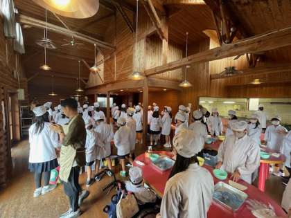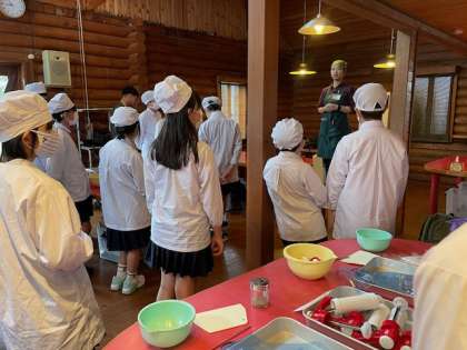 ウィンナー作り体験が始まりました。見慣れない器具と材料を目の前にして、作り方や器具の使用方法説明を聞く態度に熱が入ります。