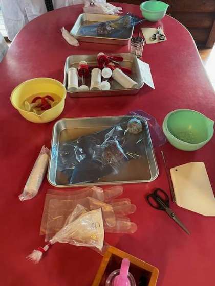 羊の腸に豚肉を詰める作業の行程は複雑ですが、グループで協力して上手に進められるかな?