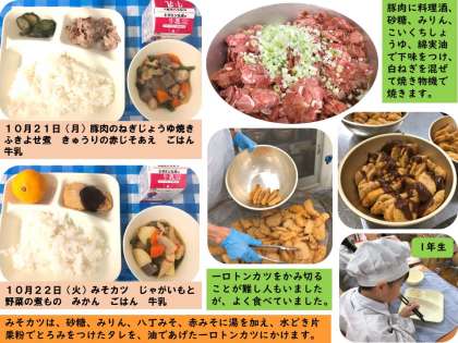 10月22日(火)の給食に愛知県の郷土料理であるみそカツが出ました。タレには、八丁みそや赤みそを使っています。低学年の児童は、歯の生え変わりの時期でもあり、かむのが難しそうでしたが、一口一口しっかりかんで食べていました。23(水)のトマトのスープスパゲッティは、10月が最後の使用月となる夏野菜の生のトマトを使っていました。24日(木)のソーキ汁は、沖縄県の郷土料理です。25日(金)のかつおのガーリックマリネ焼きは、かつおに塩、こしょう、にんにく、ノンエッグドレッシングで下味をつけ、焼き物機という名前のオーブンで焼いています。にんにくの風味で食べやすく、魚が苦手な児童でもよく食べていました。28日(月)のもずくと豚ひき肉のジューシーは、沖縄県の郷土料理です。ジューシーとは、炊き込みご飯や雑炊のことです。もずくやこんぶなどの海藻が豊富に使われ、海藻をおいしく食べることができるかなぁと思っていましたが、どの学級もしっかり食べ、ほとんど残食がありませんでした。