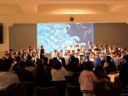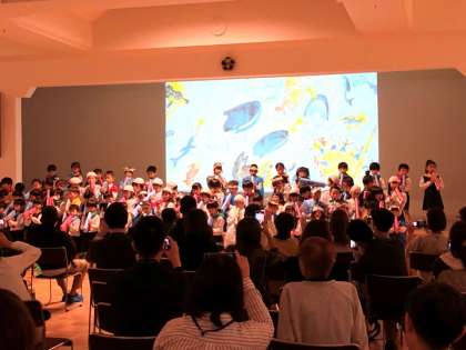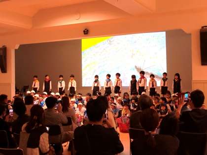 ステンドグラスや扉、ピアノ、学習の道具など、前身校の愛日小学校や集英小学校で使われていたものを現在の開平小学校でも大切に使っています。本校に通う1年生として、「昔の人から受け継いだことを忘れずに、学んでいきたいです。」と発表していました。音楽物語『うみのがくたい』でも、大きな声で、ゆっくりはっきりと、とても聞きやすく群読していました。1年生にとっては初めての学習発表会でしたが、たくさんの保護者の方々が見守る中、張り切って、元気いっぱいに物語の世界を表現していました。
