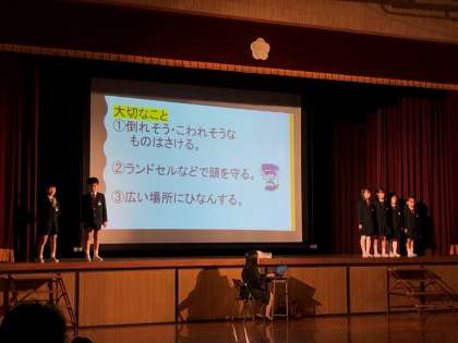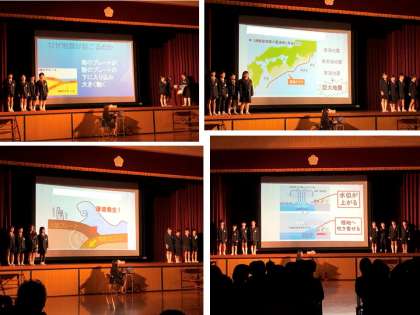 地震が起こる仕組みだけでなく、今後30年以内に発生する確率が70〜80%と言われている南海トラフ地震について、東日本大震災の時の津波の速度がオリンピックの短距離走と並ぶ速さであったことなど、具体的な例を挙げて常に意識することの大切さを発表していました。