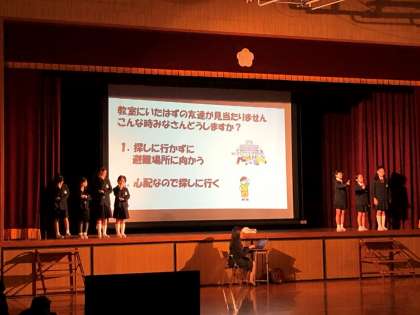 4年生の発表は、「学ぼう!開平防災ニュース」です。「4年生では、社会科で自然災害から命とくらしを守る取り組みについて学習しました。学習や社会見学を通して学んだことや、調べたことをニュース番組形式で発表します。」