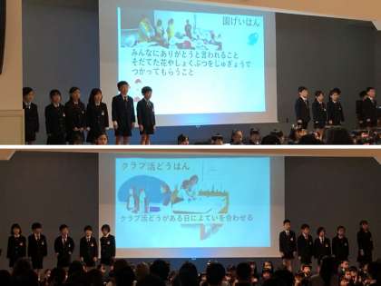 開援隊は、地域や保護者の方々のご協力で今から15年前に始まり、安全、園芸、図書、クラブ活動の4つの班があります。毎日、登下校の安全を見守っていただいていること、さつまいもの袋栽培でアドバイスをいただいたこと、工事が終了した3階ルーフテラスの学習園でたくさんの野菜を栽培してくださっていること、生活科の町たんけんにも一緒に行っていただいたことなど、2年生との関わりについて発表していました。