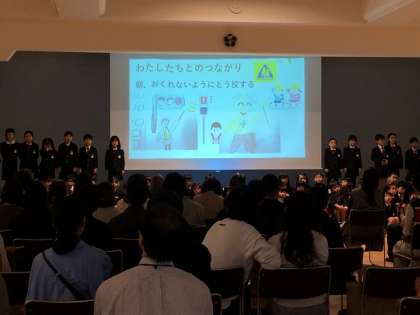 2年生の発表は、「かいへいつながりたんけんたい 〜音楽物語『お手紙』〜」です。「開平小学校でわたしたちのために活動してくださっている開援隊の方々の話を聞いて、つながりについて考えたことを発表します。国語で学習した『お手紙』を、音楽物語の歌とセリフで表現します。