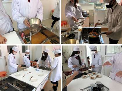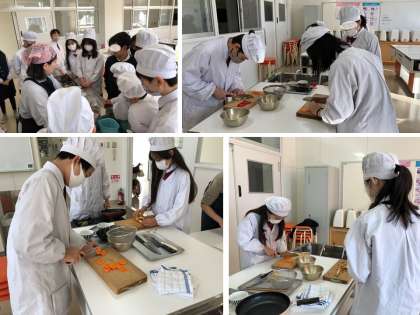 11月20(水)に6年生が調理実習を行いました。めあては「手早く副菜をつくろう」で、ごぼうとにんじんの入ったきんぴらを作ります。どちらの材料もせん切りにするので、包丁の使い方が難しい料理です。1学期に学習しているせん切りの方法を確認したり、炒める時の材料を入れる順番を考えたりしながら、段取りよく調理を進めることができました。少し油の量が多かったり、火加減が強くて焦げてしまったりした班もありましたが、試食では「焦げたけど、これはこれでおいしい!!」という声が聞かれました。今までの調理実習で様々な料理をつくる経験をしているので、家庭でも自分で作れるという自信をもって、どんどんチャレンジしてほしいです。