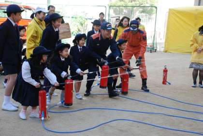 まず中央消防署の消防隊の方に、被災したり、災害に合った場合、自分たちにもできることを教えていただきました。消火訓練や、身近な物で重たい物を持ち上げる方法、けがをした人の搬送の仕方などを教えていただきました。一人一人が実際に体験しながら、被災した際の大変さや苦労を少しは感じることができたのではないかと思います。