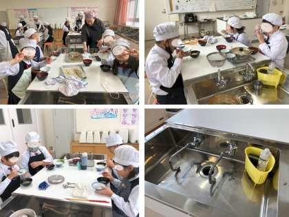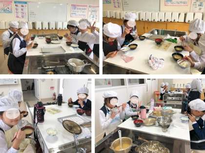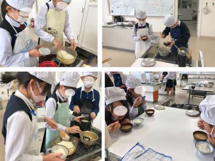 ご飯をたく時の火加減が難しかったと思いますが、どの班も焦がさず上手にできました。15分間蒸らして、いよいよ蓋を開けます。蒸気とおいしい香りが広がって、「わー!!たけてる!!」という声が上がっていました。盛り付けて試食です。「店が出せるわ。」「一粒一粒がしっかりしている。」「うまい!!」「だしの味がしっかりしている。」「だいこんが甘い。」など、自分たちで作ったご飯とみそしるのおいしさに感動していました。最後の最後までお箸は止まることなく、あっという間に完食していました。5年2組は調理だけでなく、後片付けもとても意欲的に行っていました。先に終わった班の人たちが他の班に手伝いにいくなど、全ての班が終わるまで協力して取り組むことができました。家庭科室のコンロや流しがピカピカになりました。