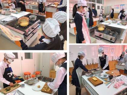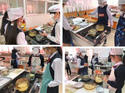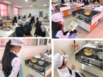 5年2組に続いて、5年1組も11月28日(木)に調理実習を行いました。ご飯とみそしるを作ります。自分たちで作ったエプロンがとても似合っていました。ご飯をたく係りの児童が、ガラス鍋に目線を合わせて姿勢を低くしたり、秒や分を数えたり、火加減を強火や弱火と調節したり、おいしくご飯をたくために決して目をはなさない姿が印象的でした。包丁の使い方では、1学期は「どうしたらいいの?」と不安そうな人が多くいましたが、みそしるの材料のうすあげやねぎを切る時にこうすればいいと自信をもって切っていました。