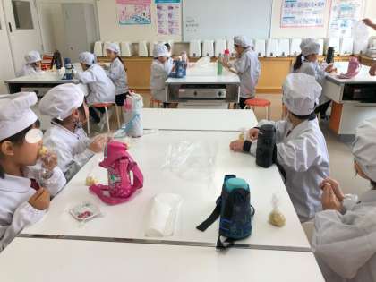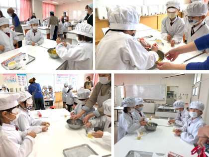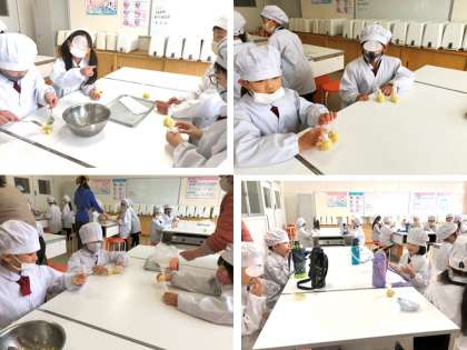 おいもパーティーでは、収穫したさつまいもを使って、茶巾しぼりを作ります。朝早くから、開援隊園芸班の方々が準備に来てくださいました。皮をむいて小さく切ったさつまいもをゆでて、マッシャーでつぶします。「1人5回ずつ、つぶそうね。」などと班で相談しながら、分担して調理をしていました。その後、砂糖とバターを入れてよく混ぜ、広げたラップの上にのせて、ラップの口をしぼったらできあがりです。