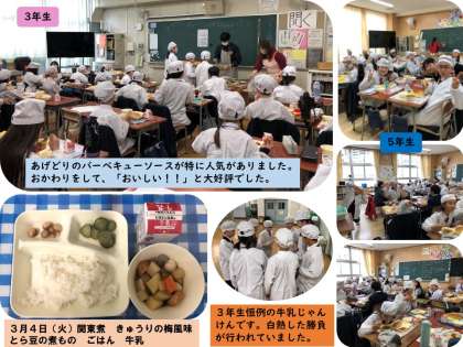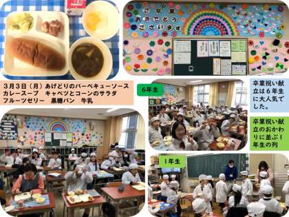 3月3日(月)は、卒業祝い献立が登場しました。全てのメニューがおいしく、特にあげどりのバーベキューソースが大人気でした。どの学級でもおかわりの行列ができていました。また、「卒業祝い献立最高!!」「うまい!!」などと言いながら、みんな笑顔でうれしそうに食べていました。卒業祝い献立をおいしく食べることで、6年生の卒業をお祝いする気持ちが高まり、お祝いの雰囲気が学校中に広がりました。4日(火)の関東煮も人気があり、6年生が「にんじんが甘い!」と言いながら食べていました。2年生からは、「昨日のあげどりのバーベキューソースと今日の関東煮のレシピを教えてほしい!!」というリクエストがありました。