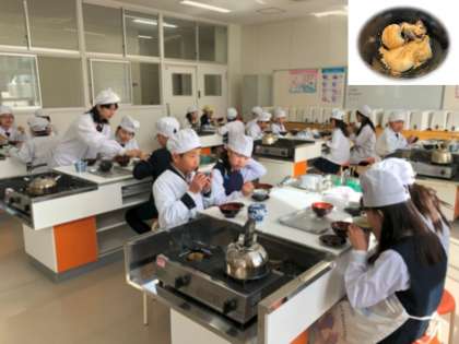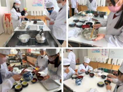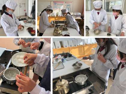 5年2組が家庭科の学習で調理実習をしました。家族とのふれ合いを楽しくするための工夫ができるようになろうということで、団らんのひと時に用意するものとして白玉だんごを作りました。白玉だんごは、水の量が多くなるとドロドロになってしまうので、水加減に気を付けながらこねていました。まるめ方は、どの班も丁度いい大きさにまるめていました。ゆでる時は、ゆで上がって白玉だんごが浮かんでくるのを1個ずつしっかりと確認していました。おいしく見えるように白玉だんごと上からかけるきな粉、あんこの盛り付け方も工夫していました。お茶を入れていよいよ試食です。自分たちが作った白玉だんごときな粉、あんこの組み合わせがとてもおいしかったようで、きな粉やあんこのおかわりをし、お皿がピカピカになるまで最後まで食べ切っていました。今回の調理実習で学習したことを活かして、家庭でも家族のために白玉だんごを作ってほしいです。
