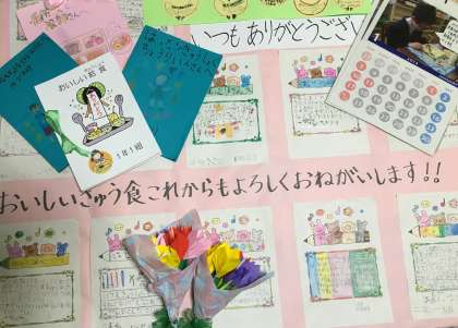 この1週間、給食調理員だけでなく、管理作業員、校長先生や教頭先生、養護教諭、事務職員など普段、教室で食べることのない先生方にも教室で一緒に給食をいただきました。