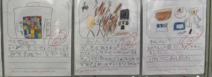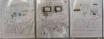 生活科の学校探検で巡った部屋について、見つけたこと、教えてもらったことなどを絵と文で書きました。たくさんの発見がありましたね。