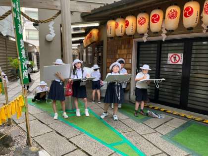 5年生は少彦名神社に写生会に行きました。曇り空に提灯の灯りが映える境内の中を題材にして、自分で決めた構図で描きます。お気に入りの画角が決まったあとはどんどんと鉛筆が進みます。絵の完成が楽しみですね。