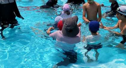 今日は開平小学校に愛珠幼稚園の年長組さんがプール交流に来ました。5年生は一緒に体操したり、プールに入って仲良くじゃんけんしたり、面倒見の良いお兄さん、お姉さんの様子を見せていました。園児さんからは、楽しかったからまた一緒に遊びたいとの感想が聞かれました。
