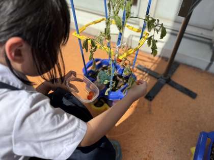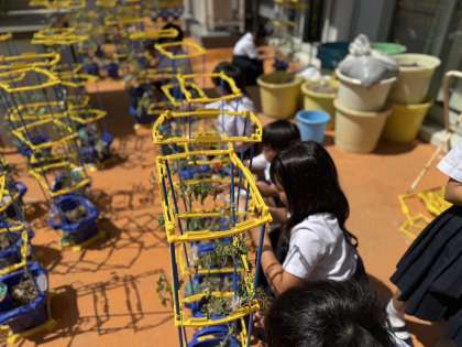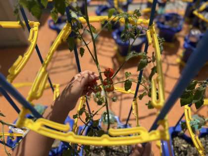 一生懸命にお世話したミニトマトがついに実をつけています。太陽の光をたっぷり浴びて赤々と色付いたトマトを丁寧に一つずつ収穫します。どんな味がするのかな。甘いかな。酸っぱいかな。子どもたちは食べるのが待ちきれないようです。