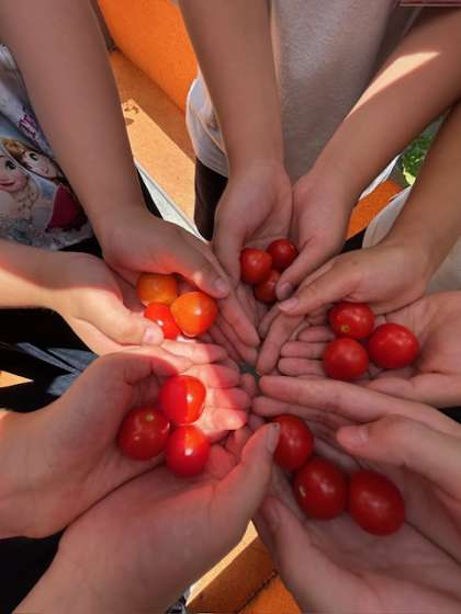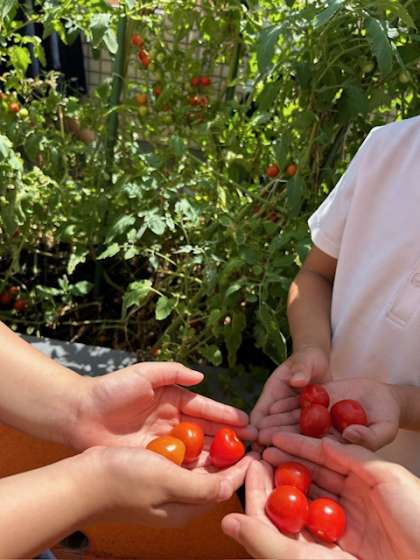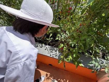 それぞれ自分の鉢で育てた分とは別に低学年ルーフテラスに植えたミニトマトも次々と収穫時期を迎えています。こちらは開援隊園芸班の皆さんを中心にお世話をしていただきました。先週自分の鉢から収穫した分と違いはあるかな?