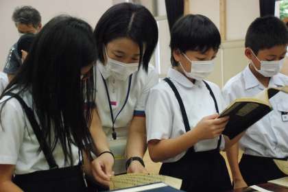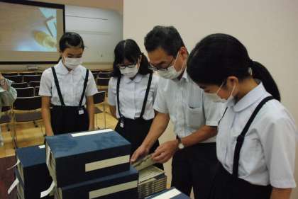 地下にある貴重庫(愛日文庫)にある貴重な古文書などを、年に1回虫干しにする活動です。本当に丁寧に埃をとりながら、また、校区である船場に残る貴重な書物の一冊一冊に思いを馳せながら取り組みました。