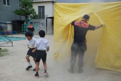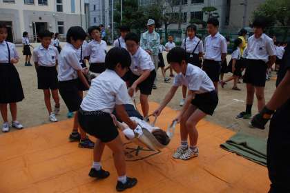 3時限目に運動場で学年に分かれて、地域の方とも一緒になって防災訓練に取り組みました。中央消防署の消防隊員の方に、救助方法・煙テント・水消火器訓練と、何かの際に自分の命・周りにいる人の命を守るための方法を教えていただきました。最後に、中央消防署長さんからご講評もいただきました。この訓練を通して、自分たちの一人一人の命の大切さを感じるとともに、たくさんの方に大切に見守られていると実感できるような素晴らしい機会になったと思います。