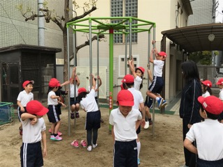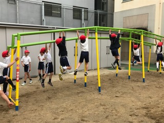 高鉄棒・雲梯(うんてい)・登り棒が、新しく使えるようになりました。約束を守って楽しく体力作り、頑張ります。