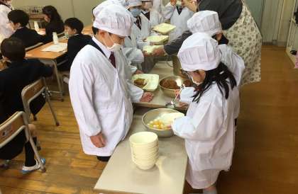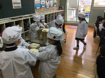 1年生2日目の給食です。自分たちで、準備しています。これぐらいかな?上手に入れられるかな……緊張しながらも、頑張っています。