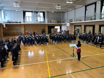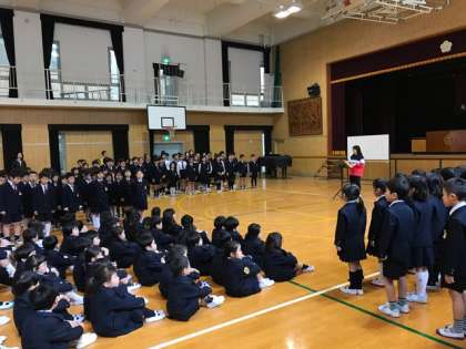 開平小学校では、毎週金曜日に全校児童で心をひとつに合唱する「音楽朝会」を行っています。4月13日、今年度初めての朝会を行いました。今日は先輩の2年生から6年生が、1年生のために「開平小学校校歌」と「ともだちはいいもんだ」の歌のプレゼントをしました。