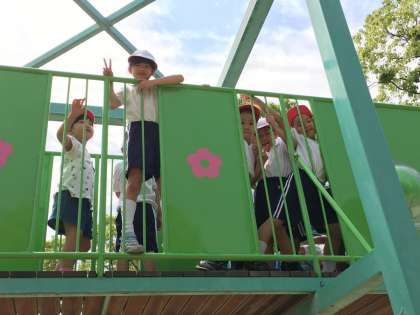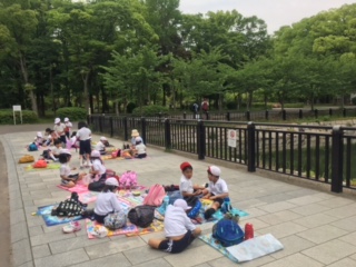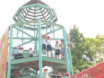 今日は楽しい遠足です。1年生は初めての遠足。遊具で楽しく遊びました。