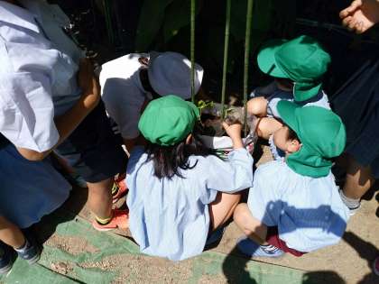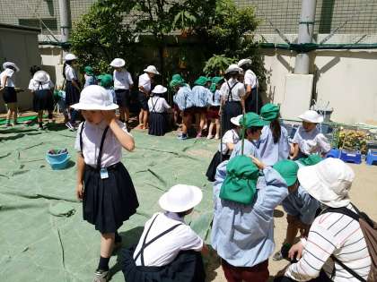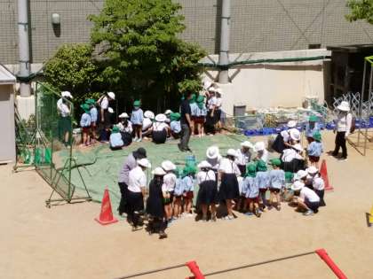愛珠幼稚園との連携で、5年生が幼稚園あか組さんとサツマイモの苗を一緒に植えました。秋の収穫が楽しみです。