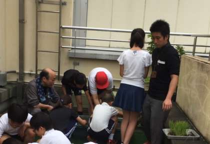 2時間目の終わりには雨も上がり、屋上のミニ田んぼに、初めての土の感触に、ドキドキしながら、また、楽しみながら、田植えを終えることができました。これから、しっかり成長を見守ります!