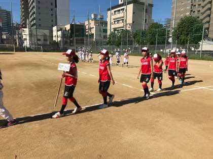 中央区子ども会キックベースボール大会が開かれました。元気一杯入場行進!試合開始!奇跡を起こすかな?