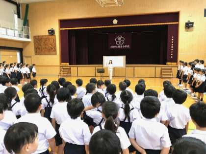 全校合唱で新しい曲に取り組んでいます。曲は「切手のないおくりもの」です。楽しく歌います。伴奏は…。