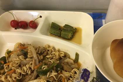 6月に1回だけ登場する「さくらんぼ」。今年も山形県から佐藤錦が届きました。艶々のピンク色が何とも美しいです。今日の献立は、「焼きそば、オクラの中華あえ、さくらんぼ、黒糖パン(小)、牛乳」。焼きそばの麺が、やや多めの30g(乾麺)使用しているので、パンは通常の半分の大きさです。オクラは6月から登場する野菜で、今日はごま油の風味を効かせたあえ物にしています。