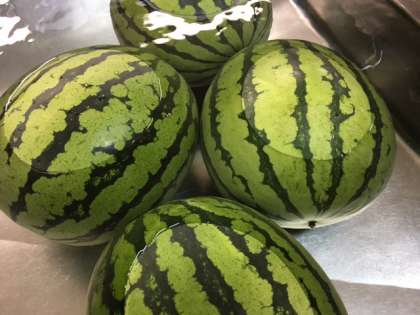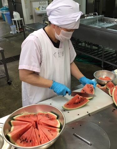 押し麦のスープは、食物せんいたっぷりの押し麦のほか、キャベツや枝豆など、具だくさん。そして、ソテーには、トマトやなす、きゅうり、そして1年に1回だけ登場の「赤ピーマン」を使用しています。にんにくの風味を効かせて炒め、少量の砂糖、塩、こしょう、ワインビネガーで味つけしています。暑い日にぴったりのさっぱりとした一品です。そして、すいか!これも1年に1回の登場です。すいかは、1個を64切れに切り分けます。子どもたちにも大好評でした。