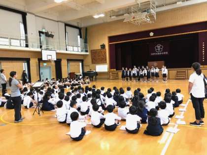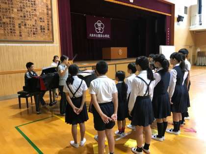 10月7日に行われる『せんば鎮守の杜音楽祭』に代表で合唱を披露するメンバーが、音楽朝会でリハーサルを行いました。