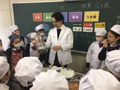 今年も5年生では、地域にある昆布屋さん「神宗」の『だしの授業』を受けることができました。2時間目、3時間目を使って、味について学んだあと、いろいろな旨みについて味わいながら学習しました。昆布とかつおぶしで実際にだしをとり、その旨みたっぷりのだしにみそを加えて「みそ汁」、みりんとしょうゆを加えてうどんだし、量を増やすと、つけ麺用のだし……と、身近にある料理の味の仕組みも学ぶことができました。