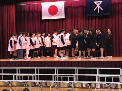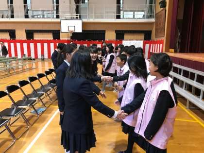 現の6年生が作り上げた『わが町船場ツアー』を、5年生に引き継ぐ式を行いました。ツアー用のベストと、思いを込めて作った案内のための一式を5年生に引継ぎました。