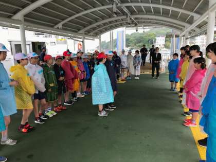 雨模様ですが波もあまりなく、無事菅島にわたってきました。菅島小学校の交流が楽しみです。