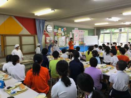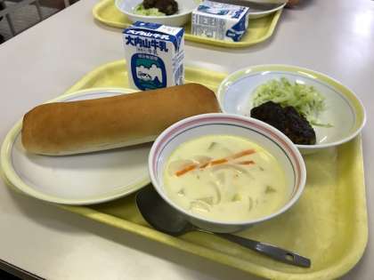 島の給食をいただきます。メインディッシュは「アカモクハンバーグ」です。