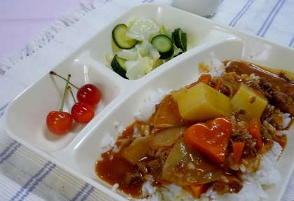 給食では、その季節においしい果物も登場します。6月は果物が豊富な月です。前回、「びわ」が登場しましたが、今日は「さくらんぼ」です。ピカピカ、きらきらの山形県から届いたさくらんぼが1人3個ずつ、つきました。それに「ハヤシライス」と「キャベツのゆずドレッシング」。ハヤシライスにはハート型のラッキーにんじんも……。楽しく、おいしくいただきました。