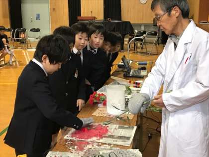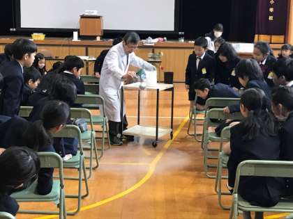 土曜授業として、本校元校長の佐藤先生にお越しいただき「マイナス196度の世界」をテーマにサイエンスショーをしていただきました。興味津々、科学の楽しさを体感しました!